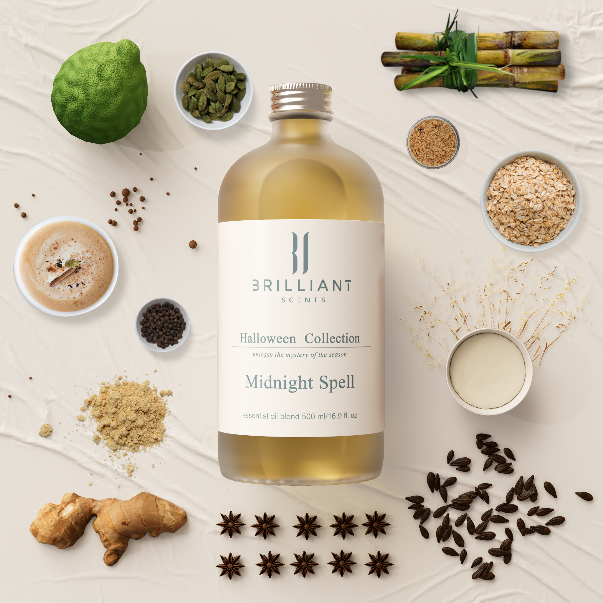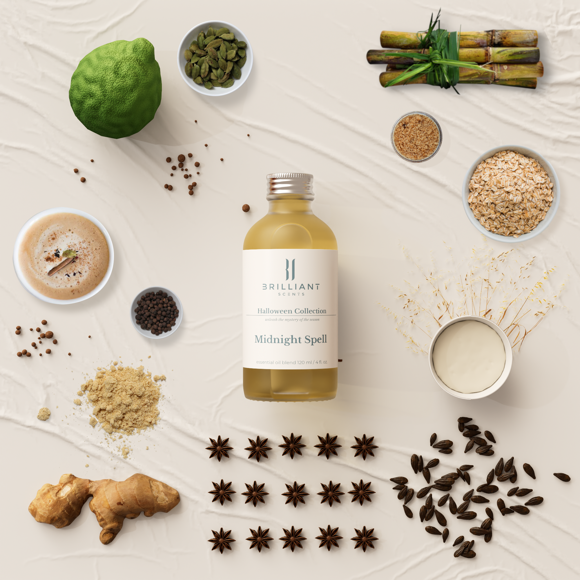 A thrilling blend of bergamot, cardamom, and zesty ginger, with a heart of allspice, chai tea, and star anise, finished with a creamy base of oat milk, sugar cane, and tonka bean.